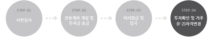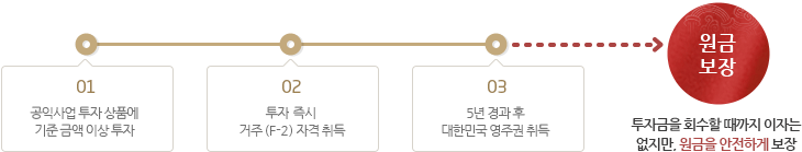 The Immigrant Investor Scheme for Public Business is the government program that allows foreigners who satisfy the investment requirements designated by the Minister of Justice to obtain F-2 resident and F-5 Permanent Resident status. For instance, those that have invested the minimum investment amounts or more in Korea and their families will be granted F-2 Resident status, and if they successfully maintain the investments for the next 5 years, they will, also, be granted permanent residency.